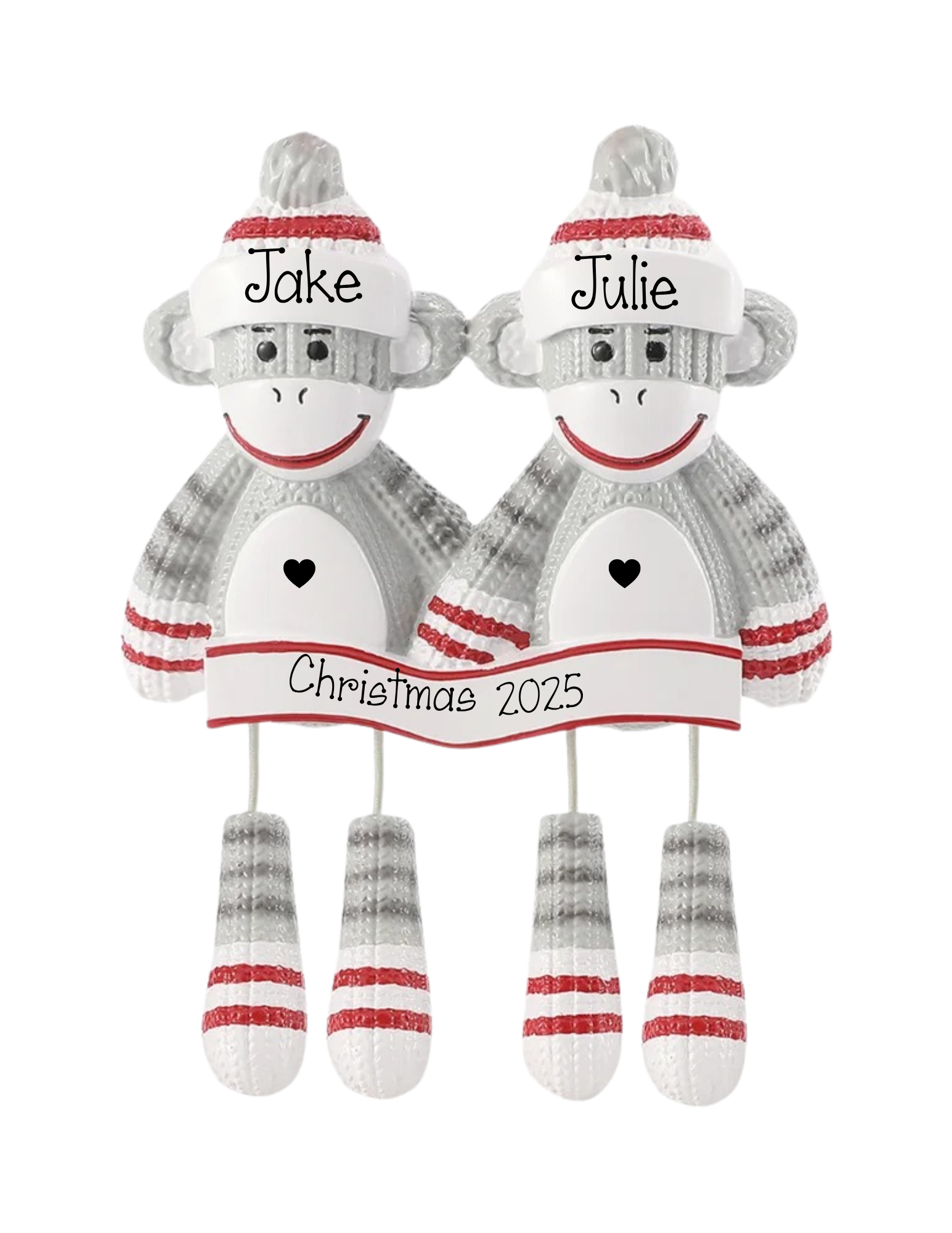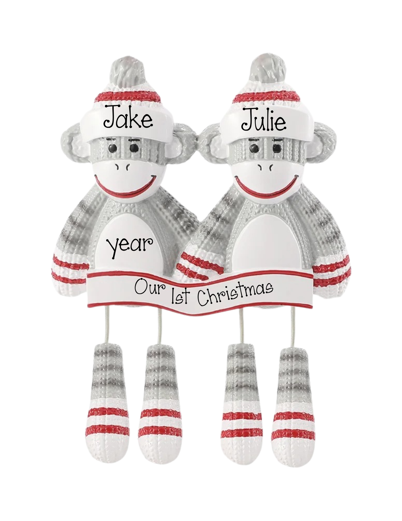Personalized Sock Monkey Couple Christmas Ornament ~ Grandkids Christmas Ornaments ~ Sock Monkey Best Friends Hand Personalized Ornament